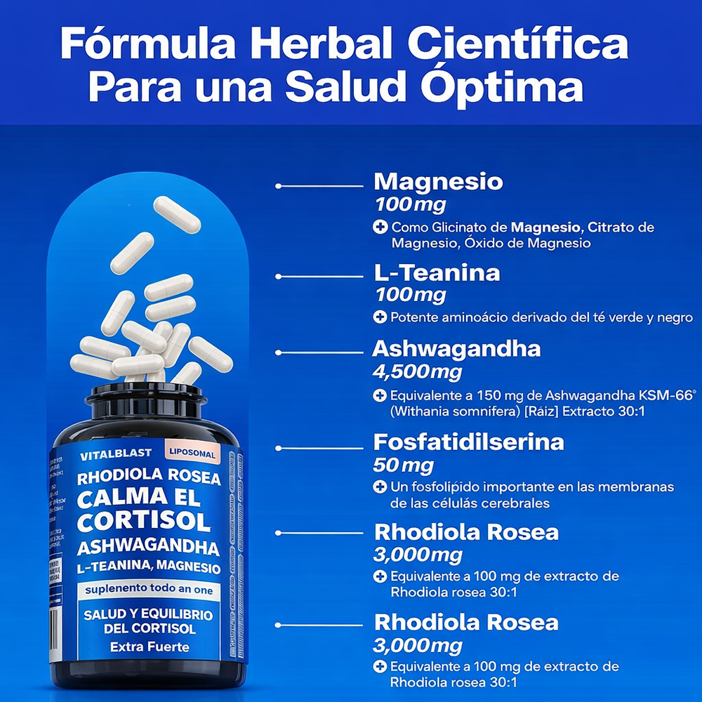 Cortisol Calm 16-en-1 reúne ingredientes clave como Magnesio, Ashwagandha, L-Teanina y Rhodiola Rosea en una fórmula avanzada diseñada para apoyar la calma mental, la relajación corporal y un descanso más reparador, con una solución natural, limpia y vegana para uso diario.